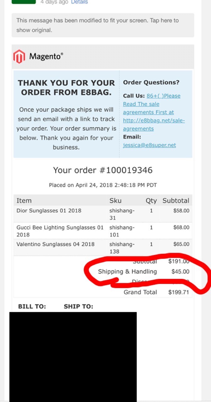thanks and best wishes.jessica—————— Original ——————From: “closet luxury”<closetluxury2016@gmail.com>;Date: Fri, Apr 27, 2018 07:16 PMTo: “jessica“<jessica@e8super.net>;Subject: E8bag: New Order # 100018975Ok but i paid the item i paid for you was sending me wrong item so how am i nagging . I have $175 but i paid shipping on the first order for 4 items and i only got 2 so you owe me on the shipping for the first order . You are charging me shipping on the new order but have not credit me for my shipping fee i paid on my first order .