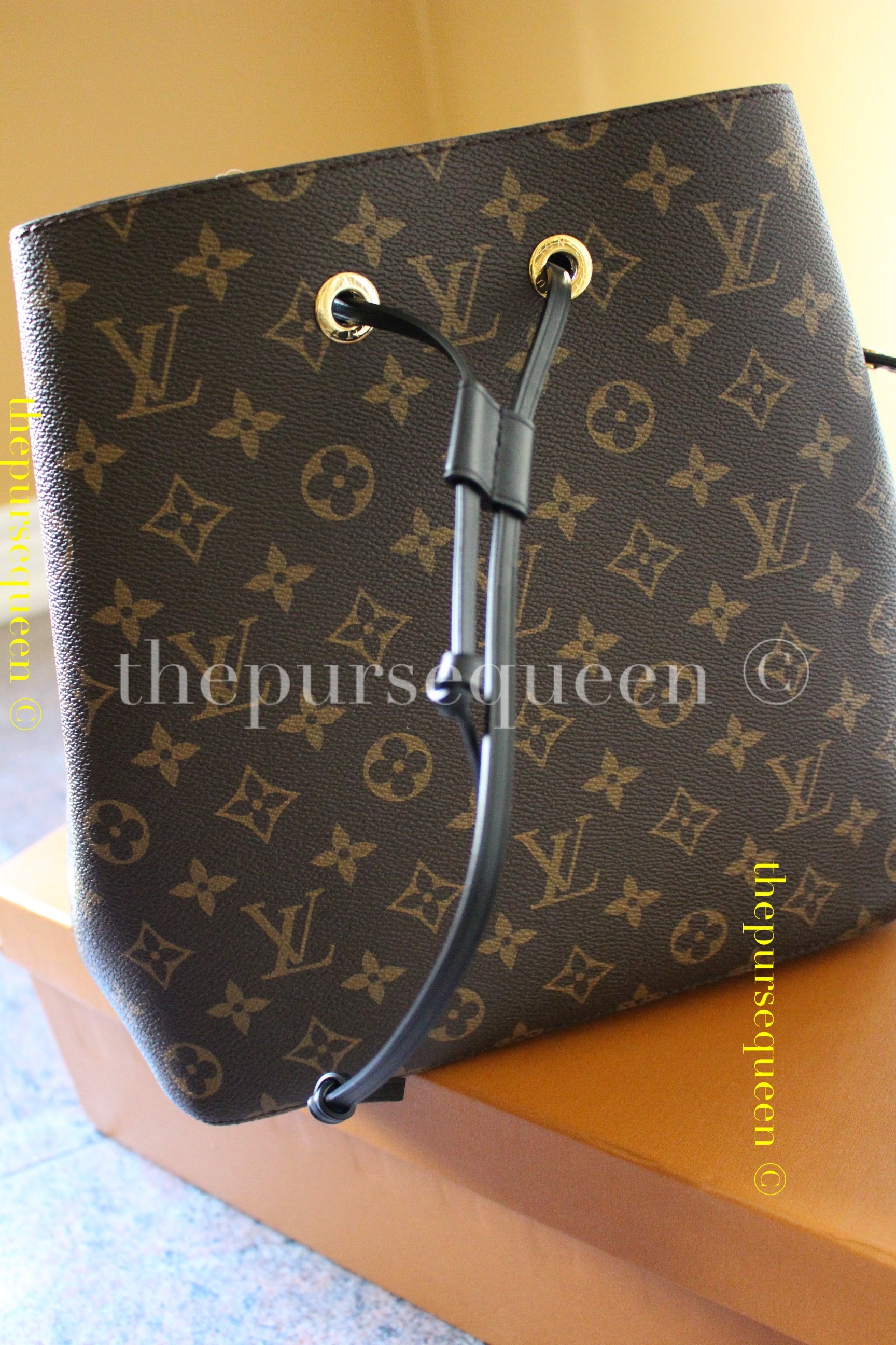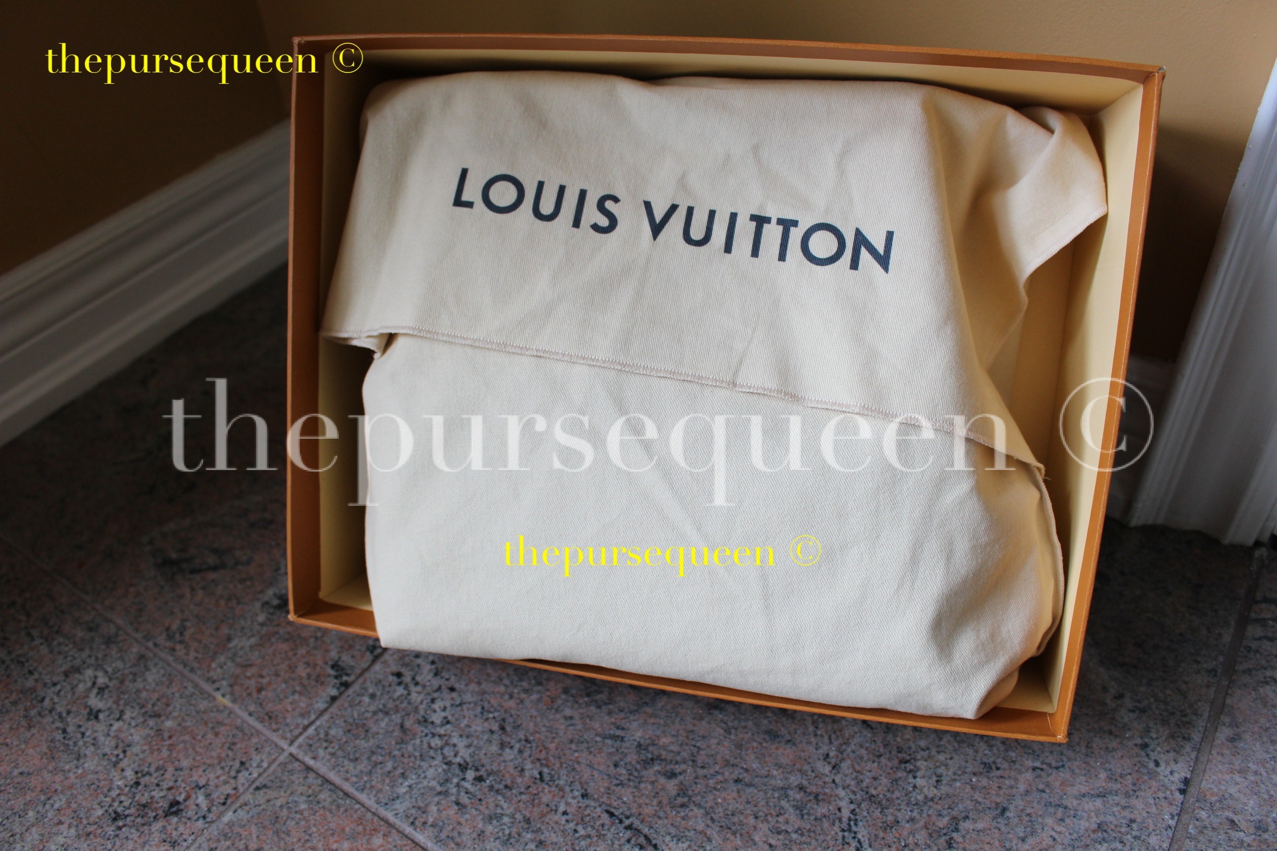 - The Louis Vuitton NéoNoé bag with its dustbag on inside the box it was shipped in.